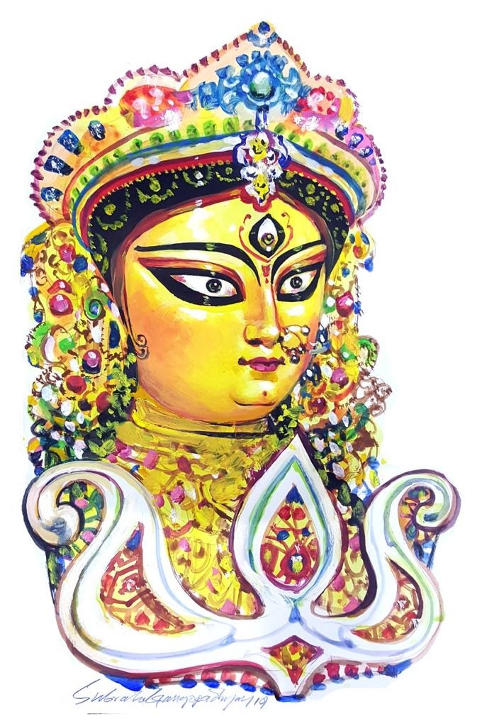 Durga idol face portrays Goddess Durga’s might and glamour. It is glittering piece of art which depicts splendour.