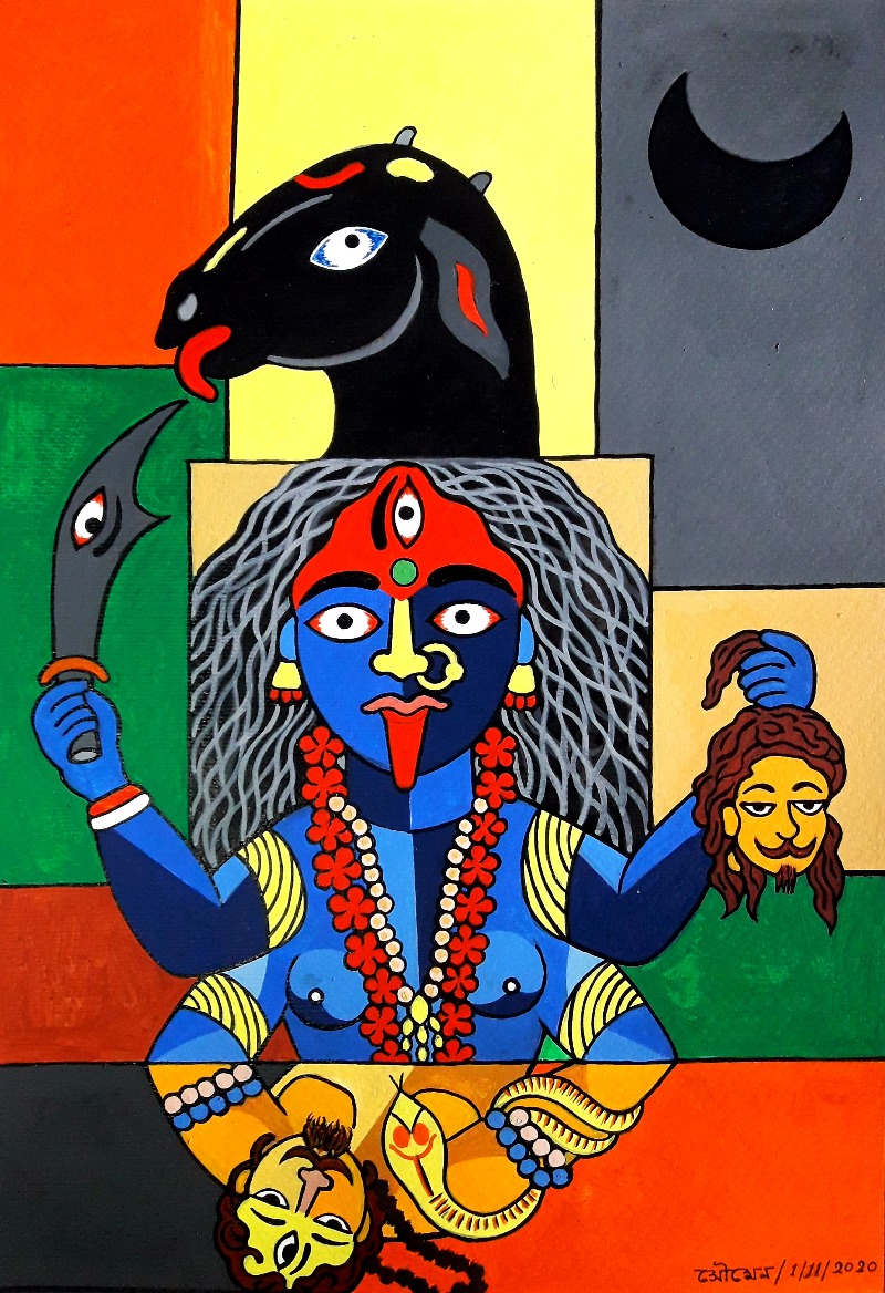 This Goddess Kali painting represent a popular iamge of Kali as the slayer of the demon Raktabija meaning BloodSeed. With every spill of his blood a new demon would emerge. To prevent this Kali would lap up the blood before it hit ground. Hence her long tongue. Another common version says that to prevent her from destroying the world in her frenzy, her husband the powerful Shiva lies on her path. She tramples over him and in her embarrassment sticks out her tongue.